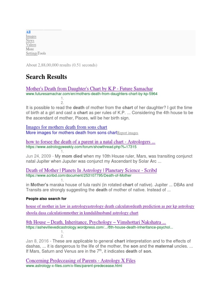 Exit from the world - death prediction in astrology - Vedic Astrology ... indicated by (C) and the trikona position from them, the death of the native's mother may take place. 8. Subtract the longitude of the lord of the nakshatra fifth from the Janma nakshatra, the longitude of the Yamakantaka. When Jupiter passes through in course of his transit, the sign or navamsa indicated by the difference or the trikona Concerning Predeceasing of Parents - astrology-x-files.com Since the mother passed away when the native was 37 years and 10 months old, we have to look at the sub periods of the general times of Cancer. At 17 years and 10 months there was a loosing of the bond from light to darkness (Cancer to Capricorn) which Valens says is frought with danger and bloodshed.