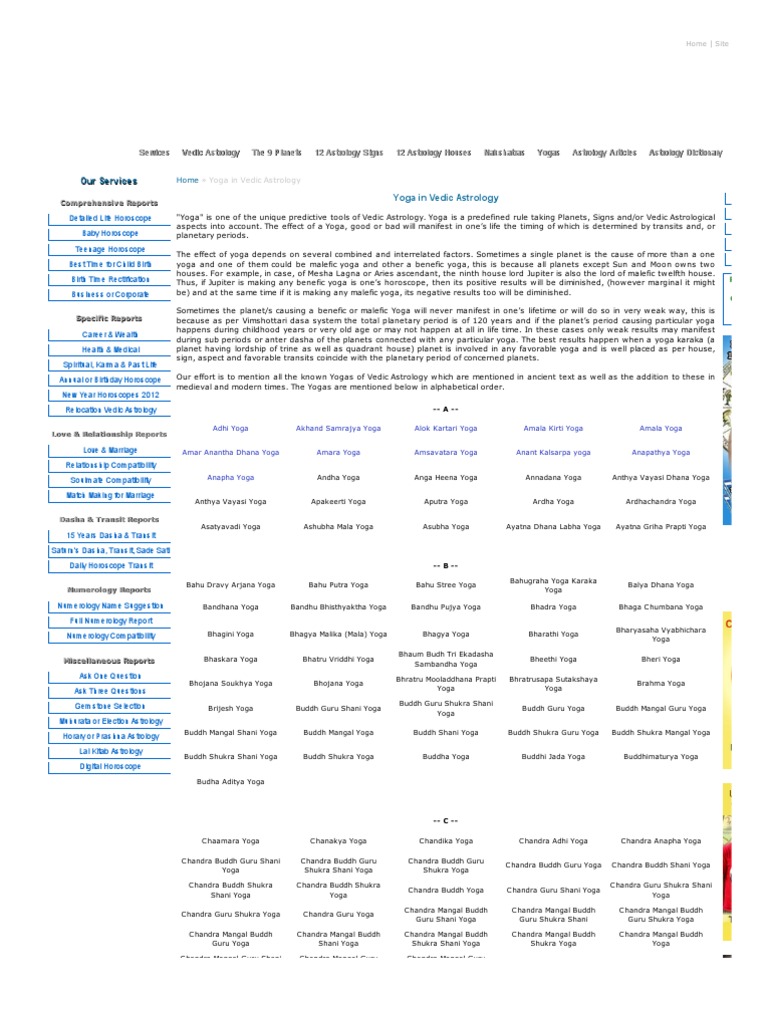 Lagnadhi Yoga Report - Indastro The underlying principle of Lagnadhi Yoga is continuous and uninterrupted success throughout one's life. The logic of this yoga rests on the placements of the benefic planets in the 6th, 7th & 8th houses from the Lagna or from Moon, where they are neither conjunct nor aspected by the malefic planets, which are in positions other than the 4th house. Amla Yoga in Kundli - Astroyogi.com Amala Yoga in Vedic astrology is responsible for the good karmas you perform in this life, which lead to fruitful results. This yoga is said to enhance your progress on the professional front. Having this yoga in your natal chart points to a high probability of achieving excellent results in almost all spheres of life. How is the Amala Yoga formed? List of Yogas in vedic Astrology - Vedic Astrology Lessons By tamiljothidamtips Last updated Feb 7, 2016. List of yogas in vedic astrology: Aakriti-Ardhachandra Yoga Aakriti-Chakra Yoga Aakriti-Chhatra Yoga Aakriti-Danda Yoga Aakriti-Dhanush Yoga Aakriti-Gada Aakriti-Hala Yoga Aakriti-Hala Yoga Aakriti-Hala Yoga Aakriti-Kamala Yoga Aakriti-Koota Yoga Aakriti-Nauka Yoga Aakriti-Pakshi (Vihaga) Aakriti ... Bharani - Wikipedia Bharani (Devanagari: भरणी) is the second nakshatra in Hindu astronomy, corresponding to 35, 39, and 41 Arietis all together. In Jyotiṣa, Bharani is ruled by Shukra (the planet Venus).Also, it is classified as a Cruel or Active nakshatra, meaning that, under electional astrological beliefs, works of a harmful or deceptive nature are best conducted while the moon is Bharani.