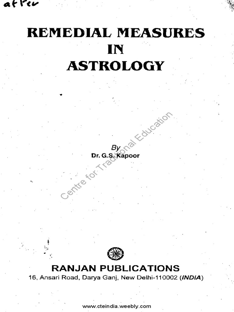 remedial measures in astrology by g s kapoor - VDOCUMENTS Kitab' for propitiation of planets-Remedial Measures illustrated by. horoscope s-Remedial Measures fordiseases caused by sinful deeds-Rudraksha a panacea for all ills and' other gifts of Nature wiuh remedialmerits-Yontros of the planets-Some. remedial mnntras for day to dayproblems. . Centr. e for . Tradit. ional . Educ ...