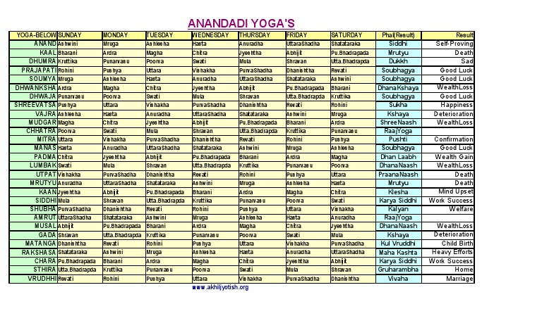 Anandadi Yogas-Pdf.Pdf - DocsLib Anandadi Yogas-Pdf.Pdf. ANANDADI YOGA'S YOGA-BELOW SUNDAY MONDAY TUESDAY WEDNESDAY THURSDAY FRIDAY SATURDAY Phal(Result) Result ANAND Ashwini Mruga Ashlesha Hasta Anuradha UttaraShadha Shatataraka Siddhi Self-Proving KAAL Bharani Ardra Magha Chitra Jyeshtha Abhijit Pu.Bhadrapada Mrutyu Death DHUMRA Kruttika Punarvasu Poorva Swati Mula Shravan Utta.Bhadrapda Dukkh Sad PRAJAPATI Rohini Pushya ...