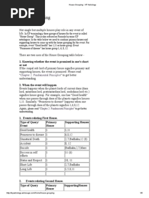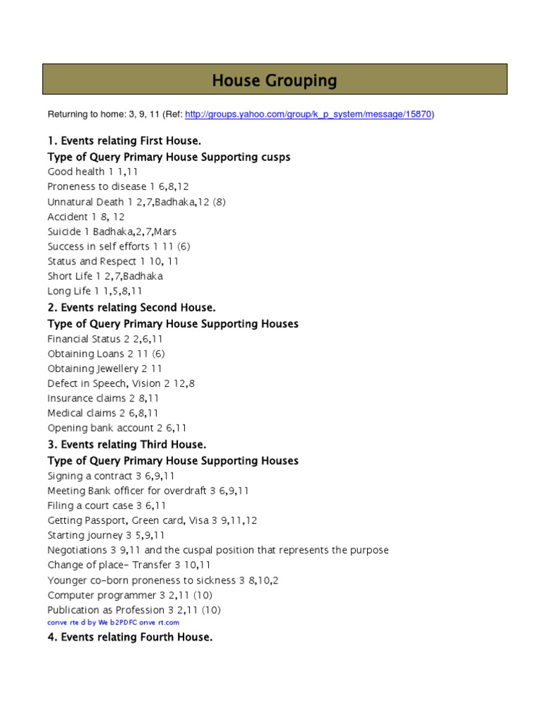 House Grouping - KP Astrology - AstroSage In KP terminology, these groups of houses for the event is called "House Group". This is also referred as Formula by some KP astrologers. In the table below we need to combine primary houses and supporting houses to come up with the house grouping for the event. For example, event "Good health" has 1,11 as house group.