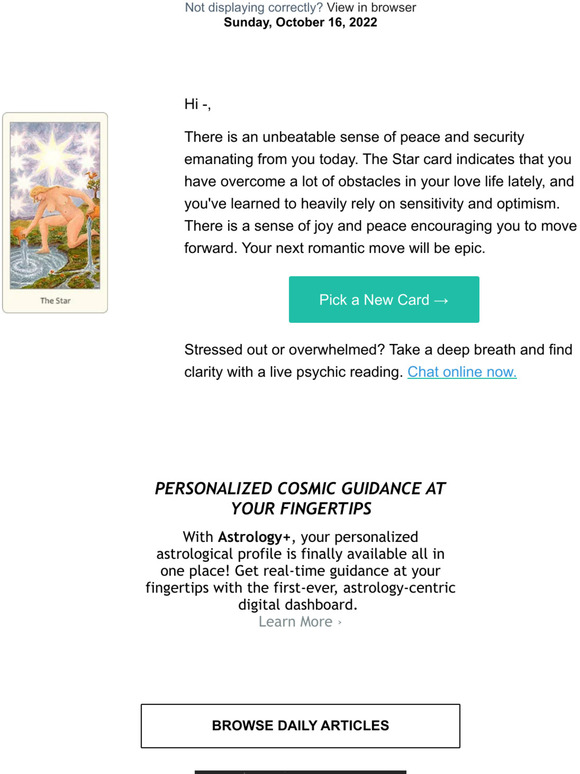 Astrology daily love tarot. › daily-love-horoscope › taurusTaurus Love Horoscope: Nov 30, 2022 | Tarot.com Nov 29, 2022 · Weekly Love Horoscopes Weekly Tarot Horoscopes Monthly Horoscopes 2023 Love Horoscopes 2023 General Horoscopes Personalized Horoscopes View All Horoscopes View All Tarot Readings More Daily Love Horoscopes. For an accurate horoscope experience, we recommend reading both your Sun and Rising sign horoscopes. Not sure what your Rising sign is? › horoscope › daily-workDaily Work Horoscope for Aries - Astrology.com Nov 29, 2022 · Astrology+ Premium Birth Chart Love Compatibility Monthly Premium Horoscope 2023 Horoscope 2023 Love Tarot 2023 Tarot Reading 2023 Vedic Horoscope 2023 Chinese Horoscope Yes/No Tarot Love Score Natal Moon Report 2023 Numerology Forecast Career Report Chakra Tarot Karma Love Report Karma Report 12-Month Transits Love Tarot and more... › horoscope › daily-loveFree Daily Love Horoscope for Taurus - Astrology.com Dec 01, 2022 · Astrology+ Premium Birth Chart Love Compatibility Monthly Premium Horoscope 2023 Horoscope 2023 Love Tarot 2023 Tarot Reading 2023 Vedic Horoscope 2023 Chinese Horoscope Yes/No Tarot Love Score Natal Moon Report 2023 Numerology Forecast Career Report Chakra Tarot Karma Love Report Karma Report 12-Month Transits Love Tarot and more... : Horoscopes, Zodiac Signs, Tarot, Astrology & More Explore Tarot.com's authentic divination experiences! Get answers with a tarot reading, unlock insight from your daily horoscope, reveal your love compatibility, and more!